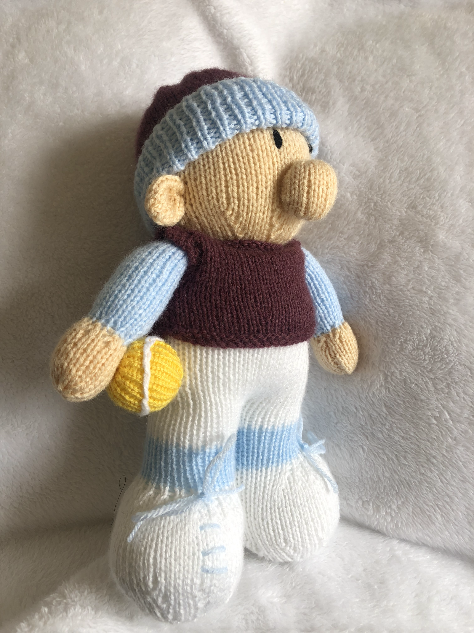 Hand Knitted Tinny Mascot in Claret and Blue.