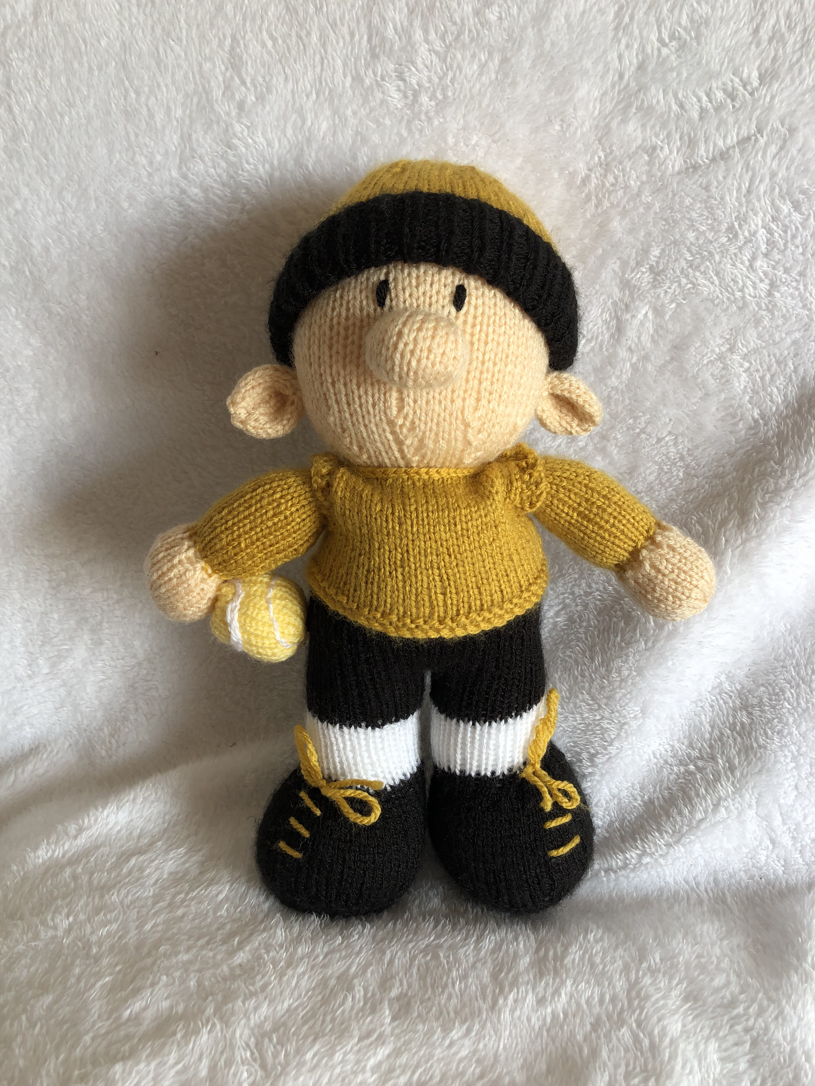 Hand Knitted Tinny Mascot in Gold and Black.