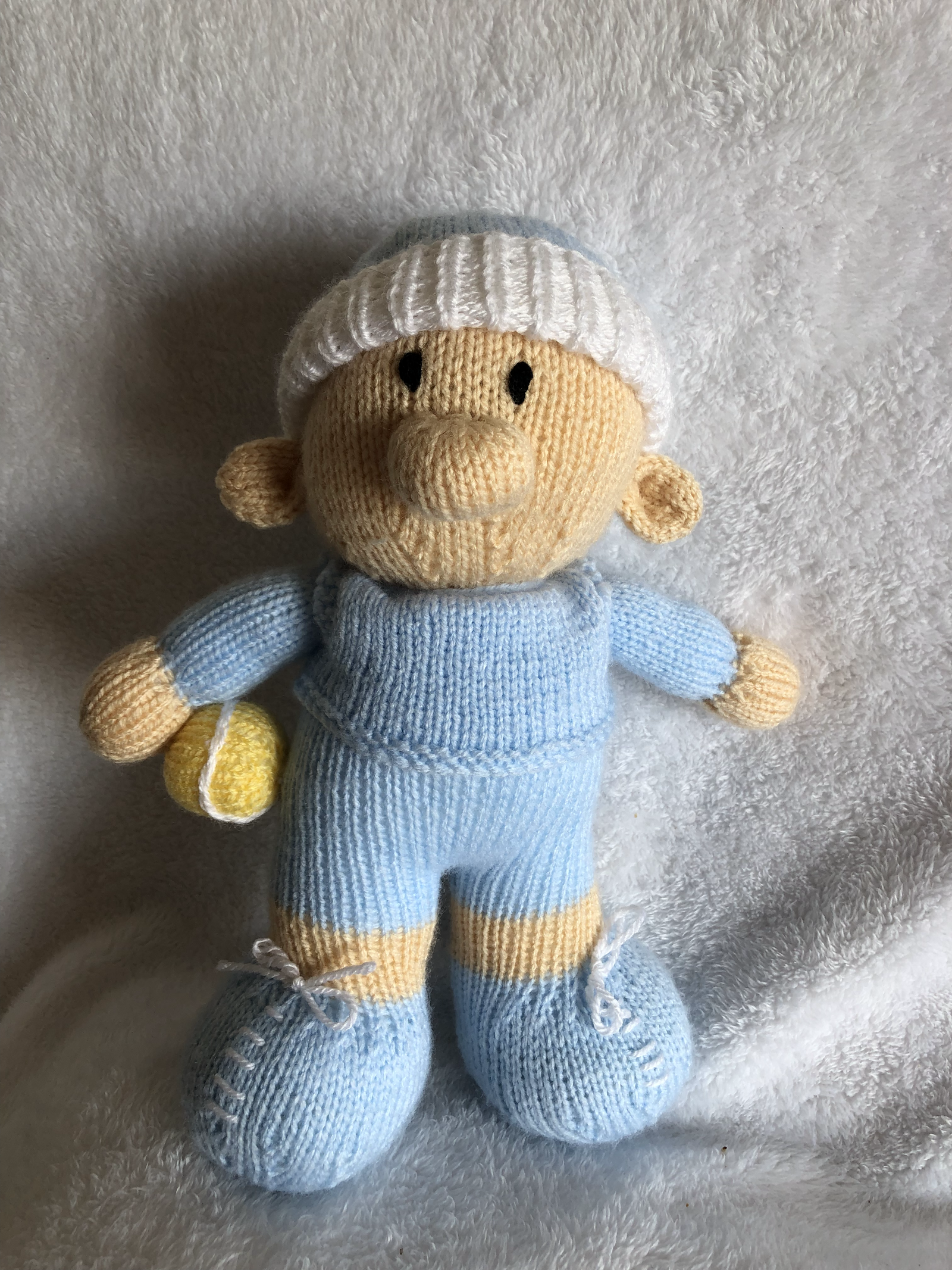 Hand Knitted Tinny Mascot in Sky Blue and White.